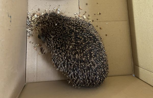 When we arrived to pick him up, our spiky friend was shuffling around the box and clearly very happy with his food. These were good signs because uncurling meant he felt safe, and feeding himself meant we could bring him to the Avolare Wildlife Rescue Centre instead of the rescue centre in Nijkerkerveen which is where we bring baby hedgehogs. As Avolare is closer, this hedgehog will get his help more quickly!